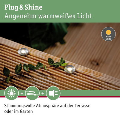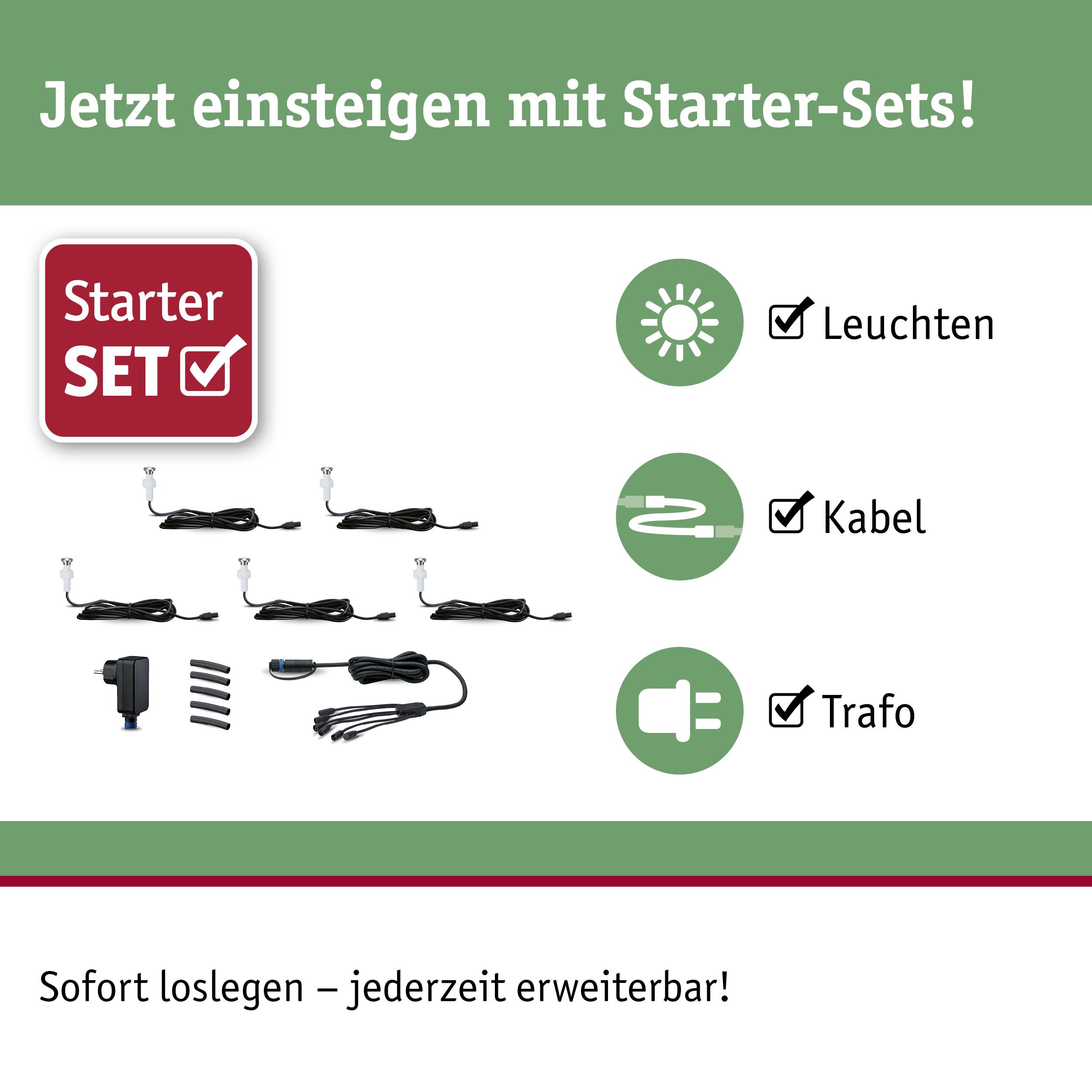 - Plug & Shine Basisset bestehend aus 5 Leuchten, Verbindungskabel und Trafo