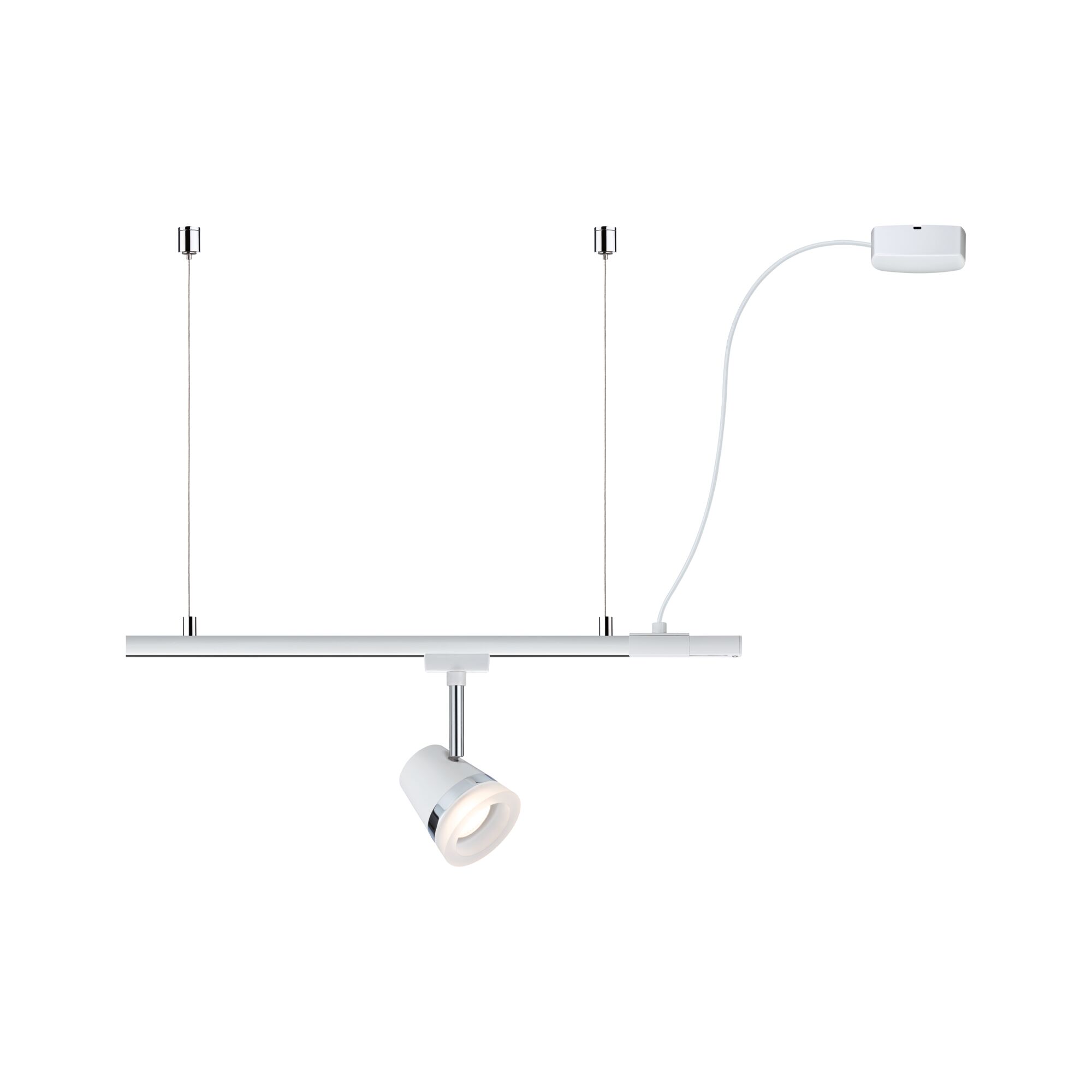 Die 230 Volt hängende Einspeisung in Weiß ermöglicht eine Lichtinstallation für bis zu 2m am Seil abgehängte Systeme. Dies ermöglicht eine Installation an hohen Decken, da sich die Lichtquelle tiefer in den Raum anbringen lässt. Die Flexibilität in der Raumgestaltung durch ein Schienensystem geht dabei nicht verloren. Wir empfehlen bei der Schienenanordnung mindestens eine L-Form, besser eine Z- oder U-Form zu bauen. Andernfalls sind nur rotationssymmetrische Leuchten möglich, da sonst die Schiene am Seil kippt.